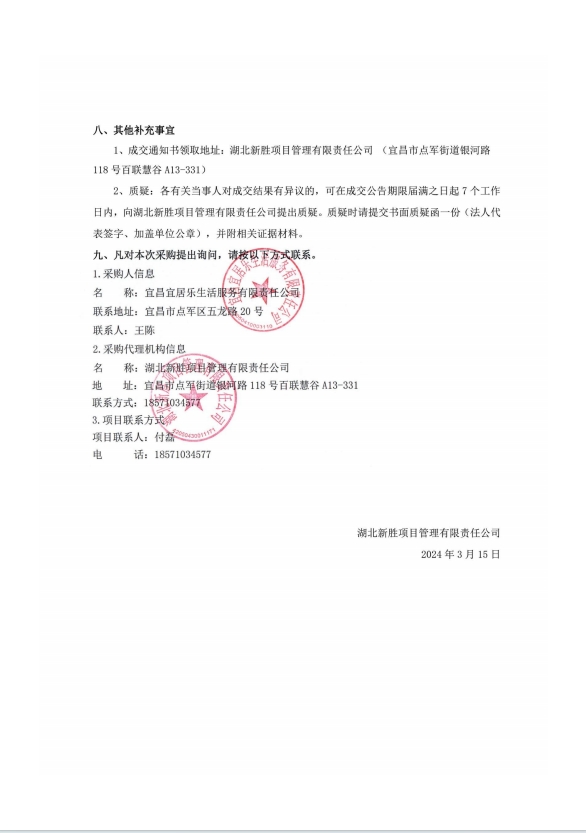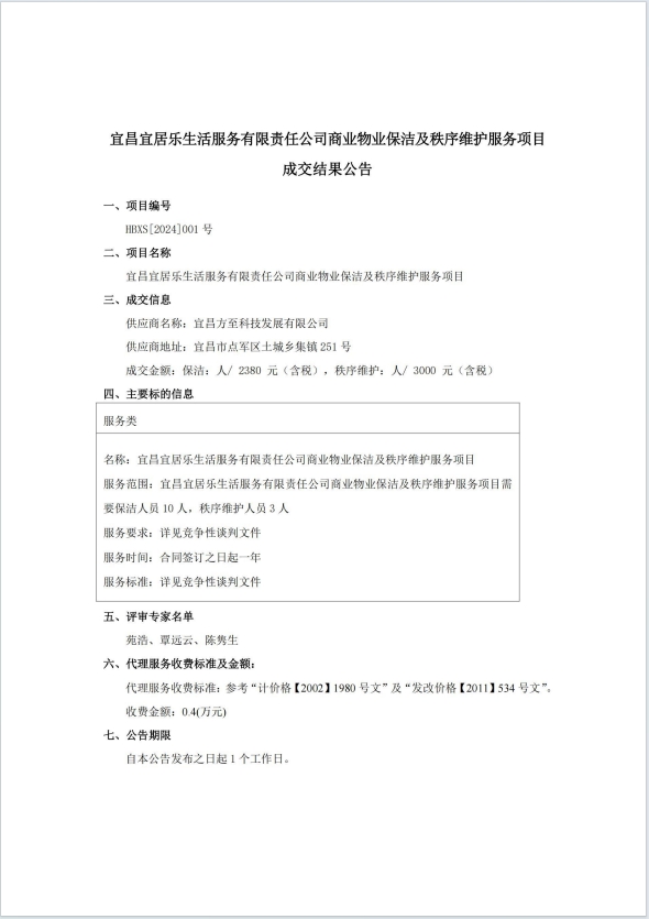 宜昌宜居樂生活服務有限責任公司商業物業保潔及秩序維護服務項目成交結果公告