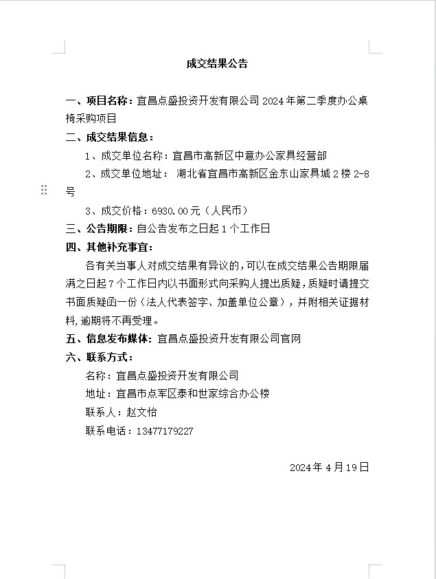宜昌點盛投資開發有限公司2024年第二季度辦公桌椅采購項目成交公告