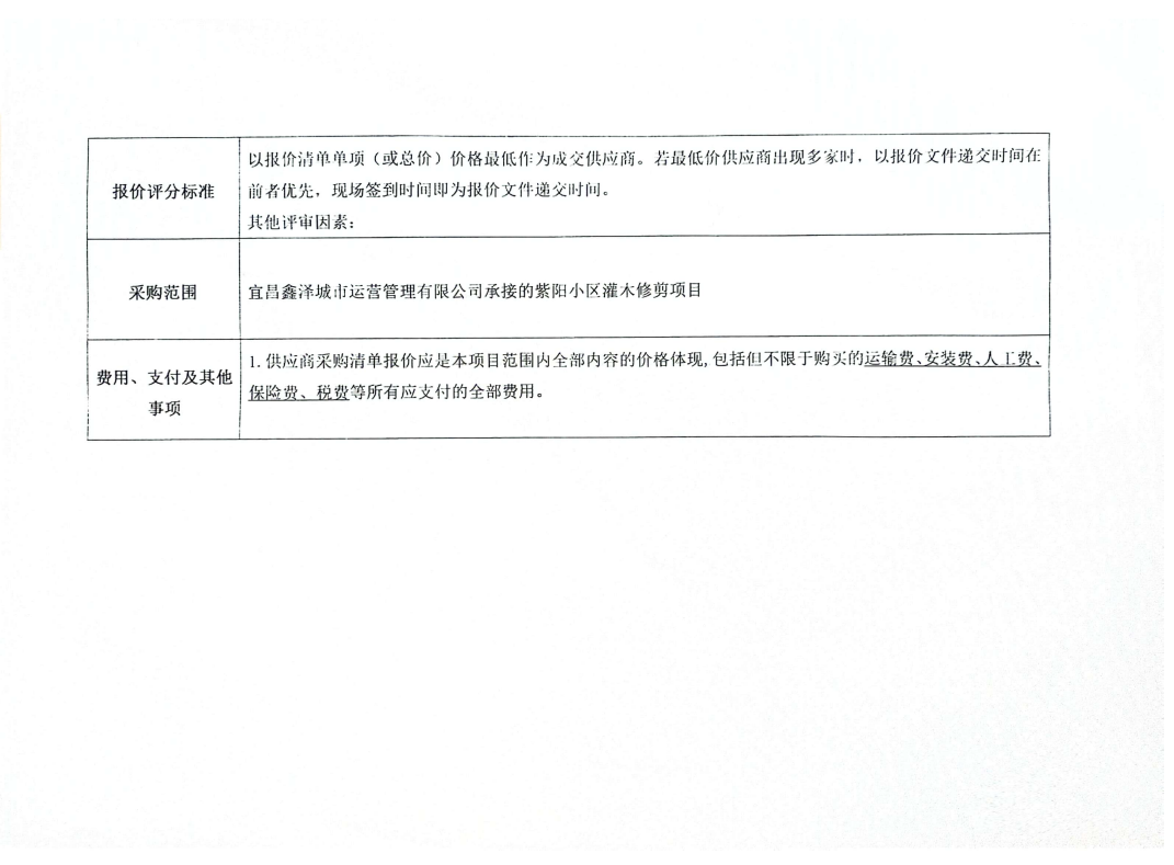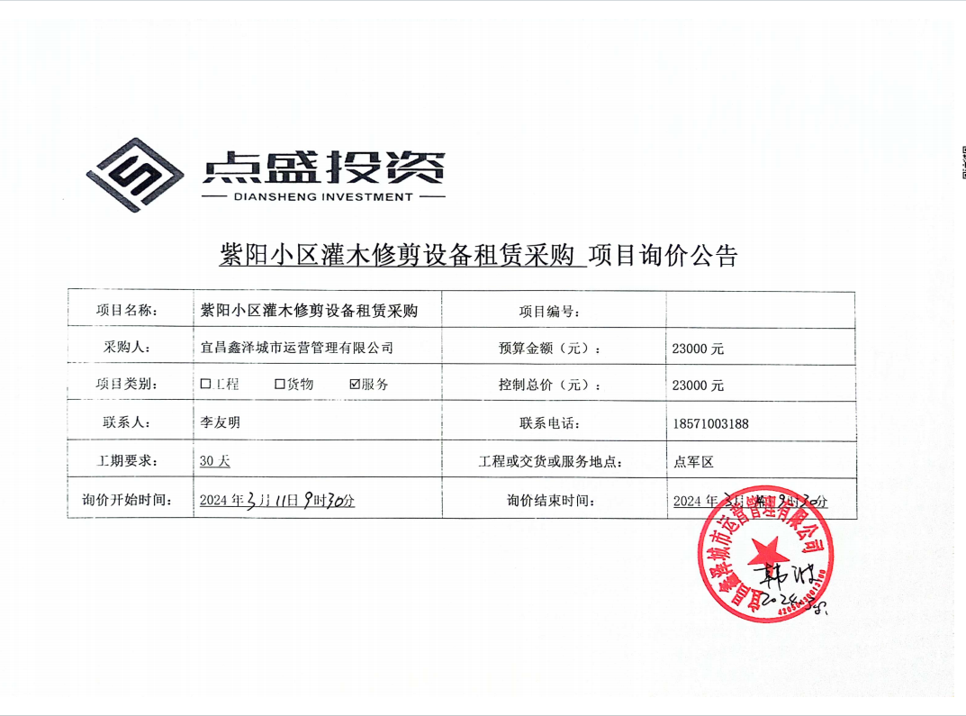 宜昌鑫澤城市運營管理有限公司管紫陽小區灌木修剪設備租賃采購項目詢價公告