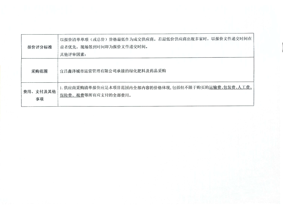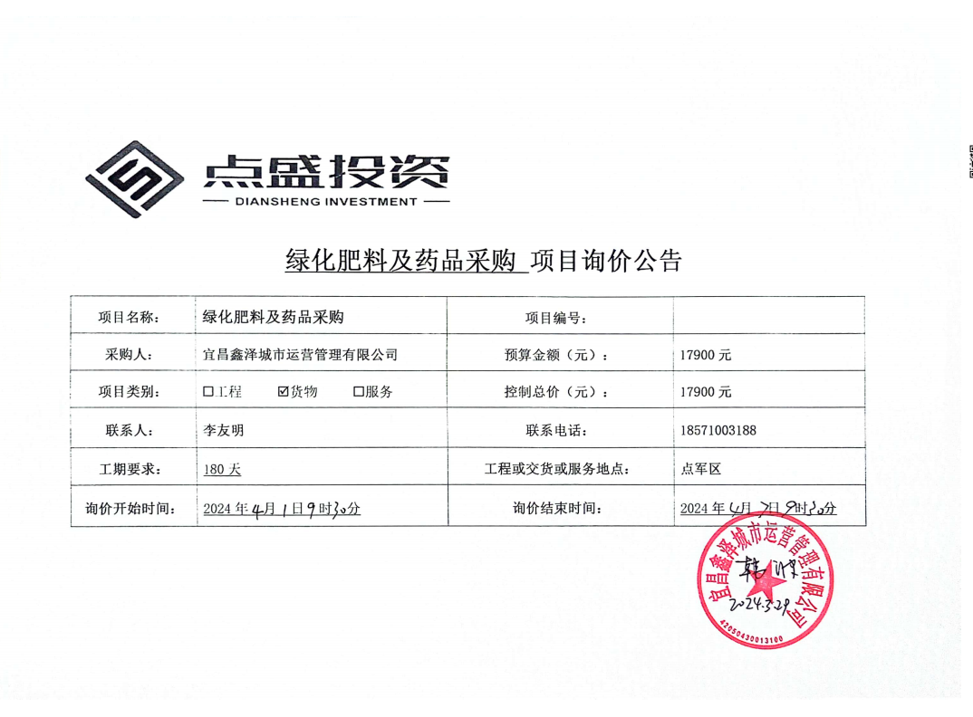 宜昌鑫澤城市運(yùn)營管理有限公司綠化肥料及藥品采購項(xiàng)目詢價公告