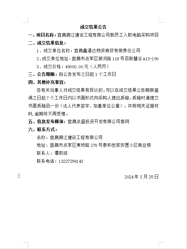 宜昌擁江建設(shè)工程有限公司新員工入職電腦采購(gòu)項(xiàng)目成交公告
