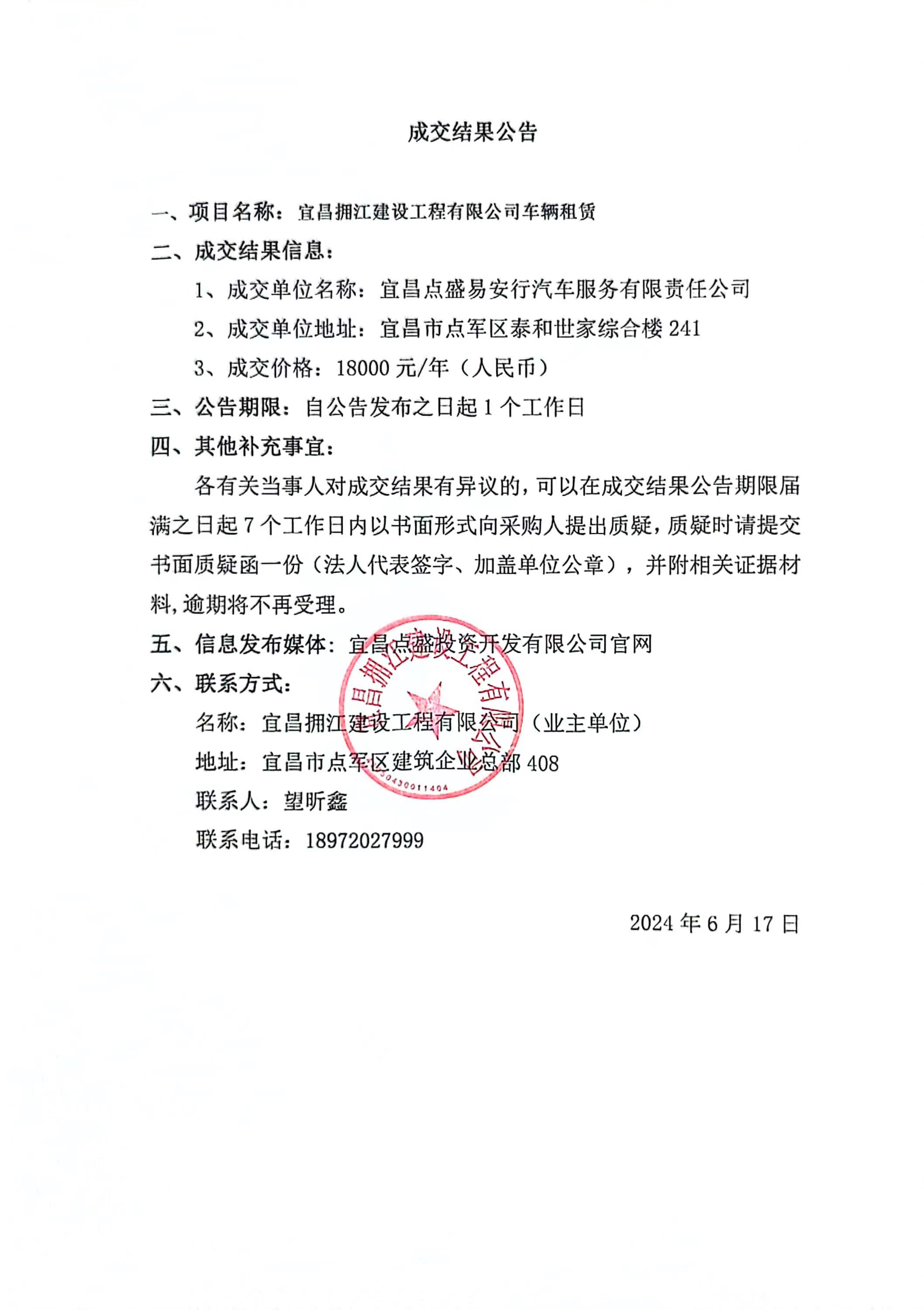 宜昌擁江建設工程有限公司車輛租賃項目成交公告