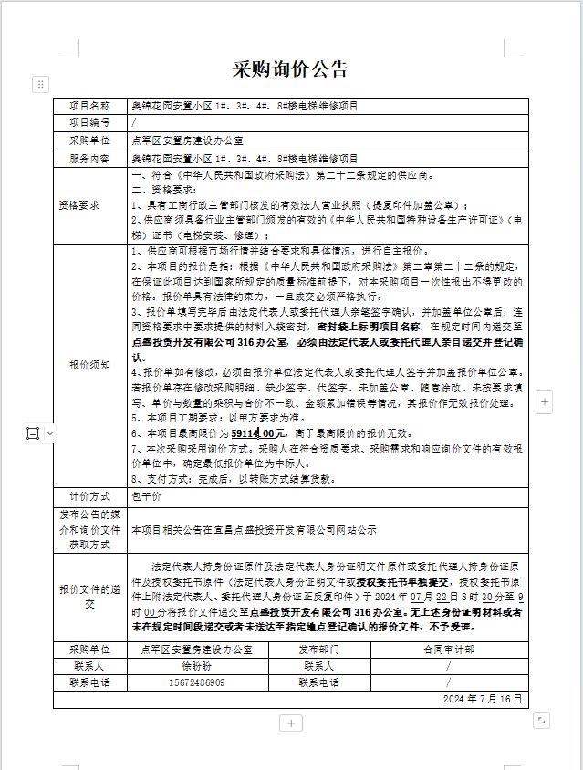 奧錦花園安置小區1#、3#、4#、8#樓電梯維修項目詢價公告