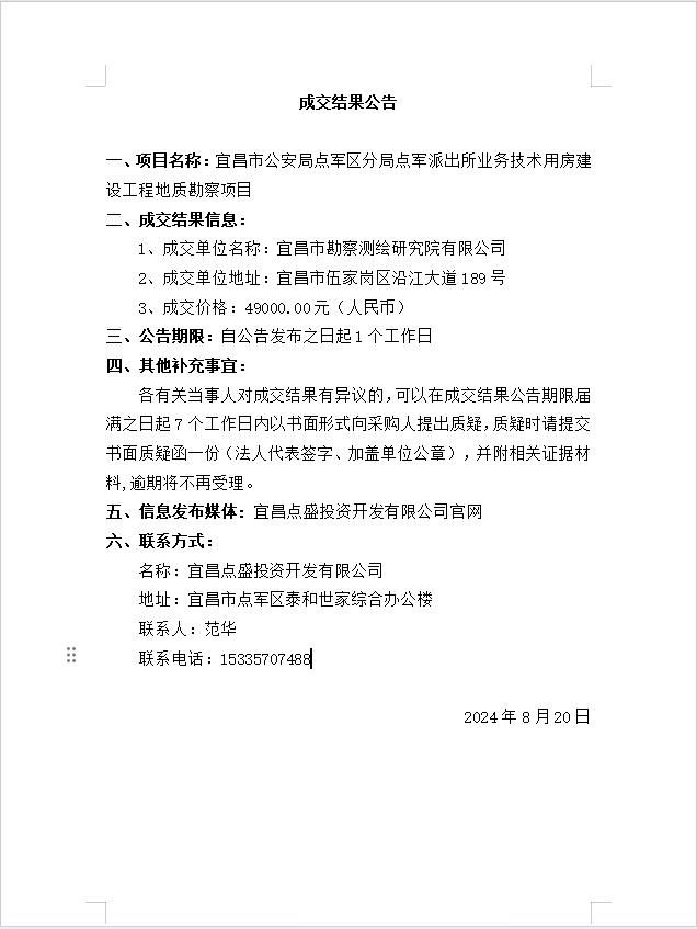 宜昌市公安局點軍區分局點軍派出所業務技術用房建設工程地質勘察項目成交公告