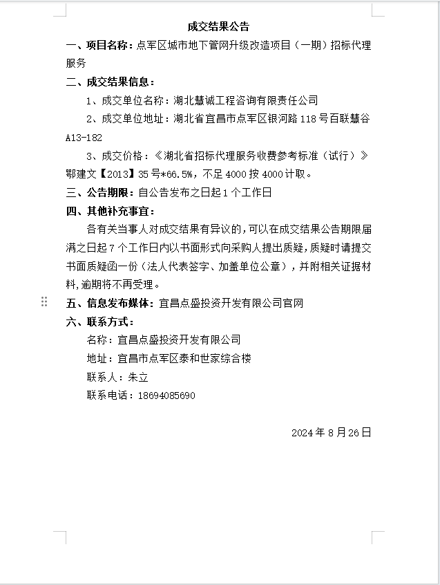 點(diǎn)軍區(qū)城市地下管網(wǎng)升級改造項目(一期)招標(biāo)代理服務(wù)成交公告