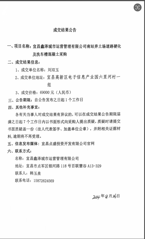 宜昌鑫澤城市運(yùn)營管理有限公司南站棄土場(chǎng)道路硬化及洗車槽混凝土采購項(xiàng)目成交公告