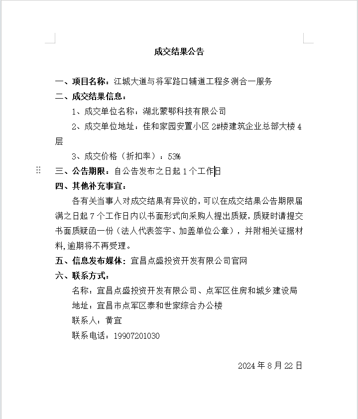 江城大道與將軍路口輔道工程多測合一服務成交公告