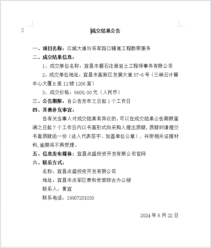 江城大道與將軍路口輔道工程勘察服務(wù)成交公告