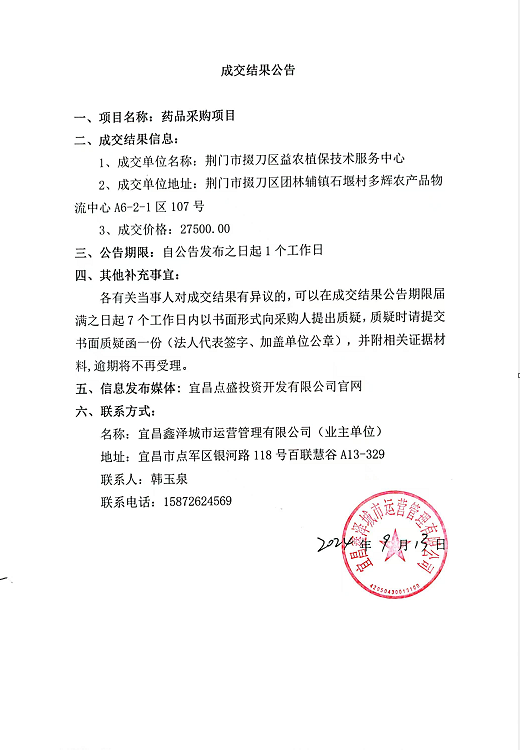宜昌鑫澤城市運營管理有限公司藥品采購項目成交公告