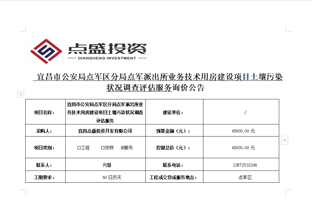 宜昌市公安局點軍區分局點軍派出所業務技術用房建設項目土壤污染狀況調查評估服務詢價公告