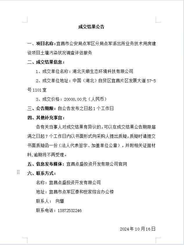 宜昌市公安局點軍區分局點軍派出所業務技術用房建設項目土壤污染狀況調查評估服務成交公告