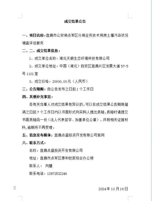 宜昌市公安局點軍區分局業務技術用房土壤污染狀況調查評估服務成交公告