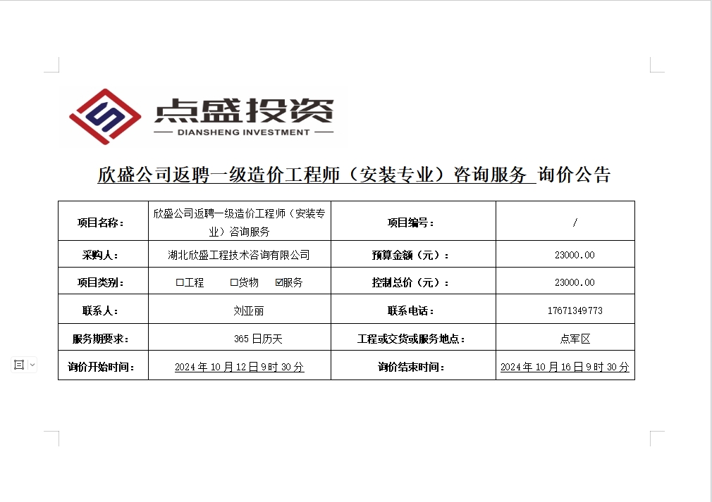 欣盛公司返聘一級造價工程師(安裝專業(yè))咨詢服務詢價公告