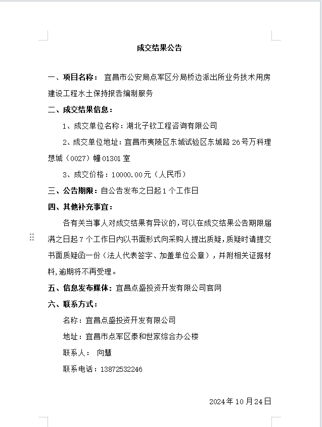 宜昌市公安局點軍區分局橋邊派出所業務技術用房建設工程水土保持報告編制服務成交公告
