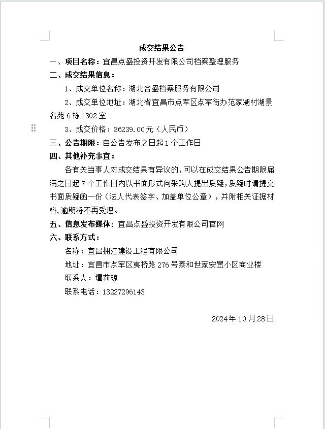 宜昌點盛投資開發有限公司檔案整理服務成交公告