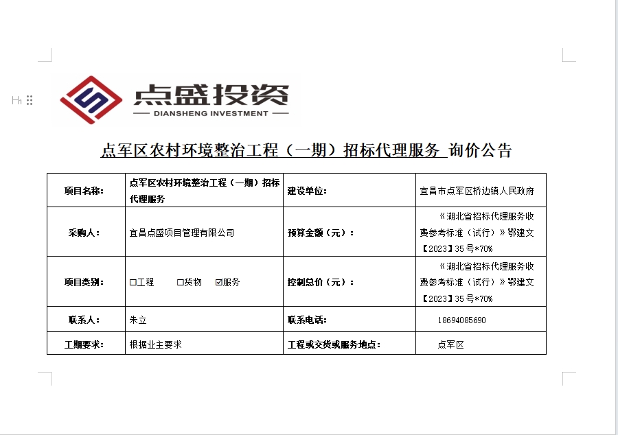 點軍區農村環境整治工程(一期)招標代理服務詢價公告